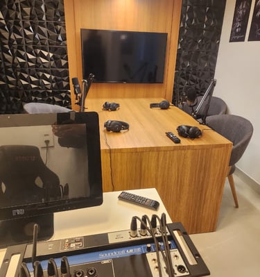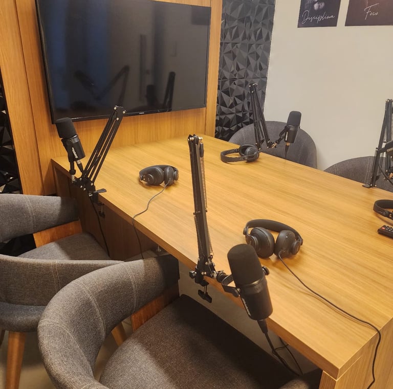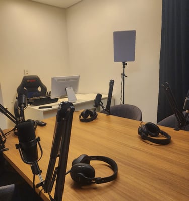 Nosso estúdio está localizado em um ambiente criativo, perfeito para gravar podcasts, vídeos e muito mais com qualidade profissional.